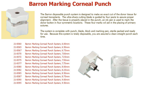 The Barron Marking corneal donor punch is a unique disposable punch system designed to make an exact cut of the donor tissue for corneal transplants. The ultra sharp cutting blade is guided by four posts to assure proper alignment. After the tissue is properly placed in the punch, an ink pen is used to mark the donor buttons in four symmetric locations. These marks will aid in the placing of primary sutures.